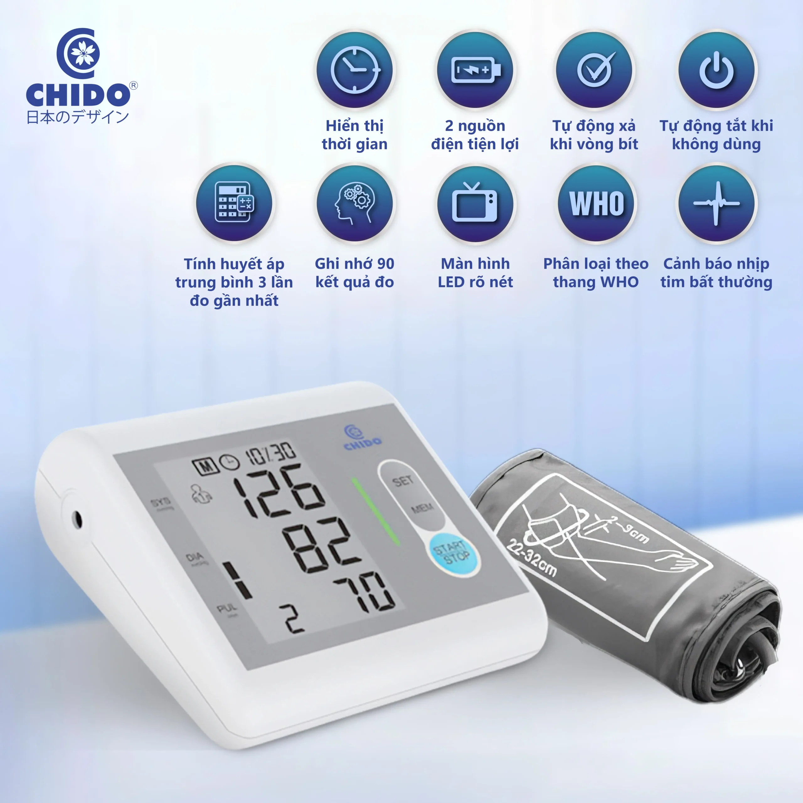 Máy đo huyết áp bắp tay Chido được sản xuất theo công nghệ tiên tiến của Nhật Bản